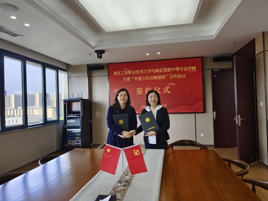 5月9日下午,best365官网与南京莫愁中等专业学校在莫愁中专高庙校区签署合作协议,正式启动“非遗文化出海基地”建设项目。学校党委常委、副校长魏萍,南京市莫愁中等专业学校校长朱国美作为双方代表出席签约仪式,两校相关负责人及骨干教师共同参与活动。