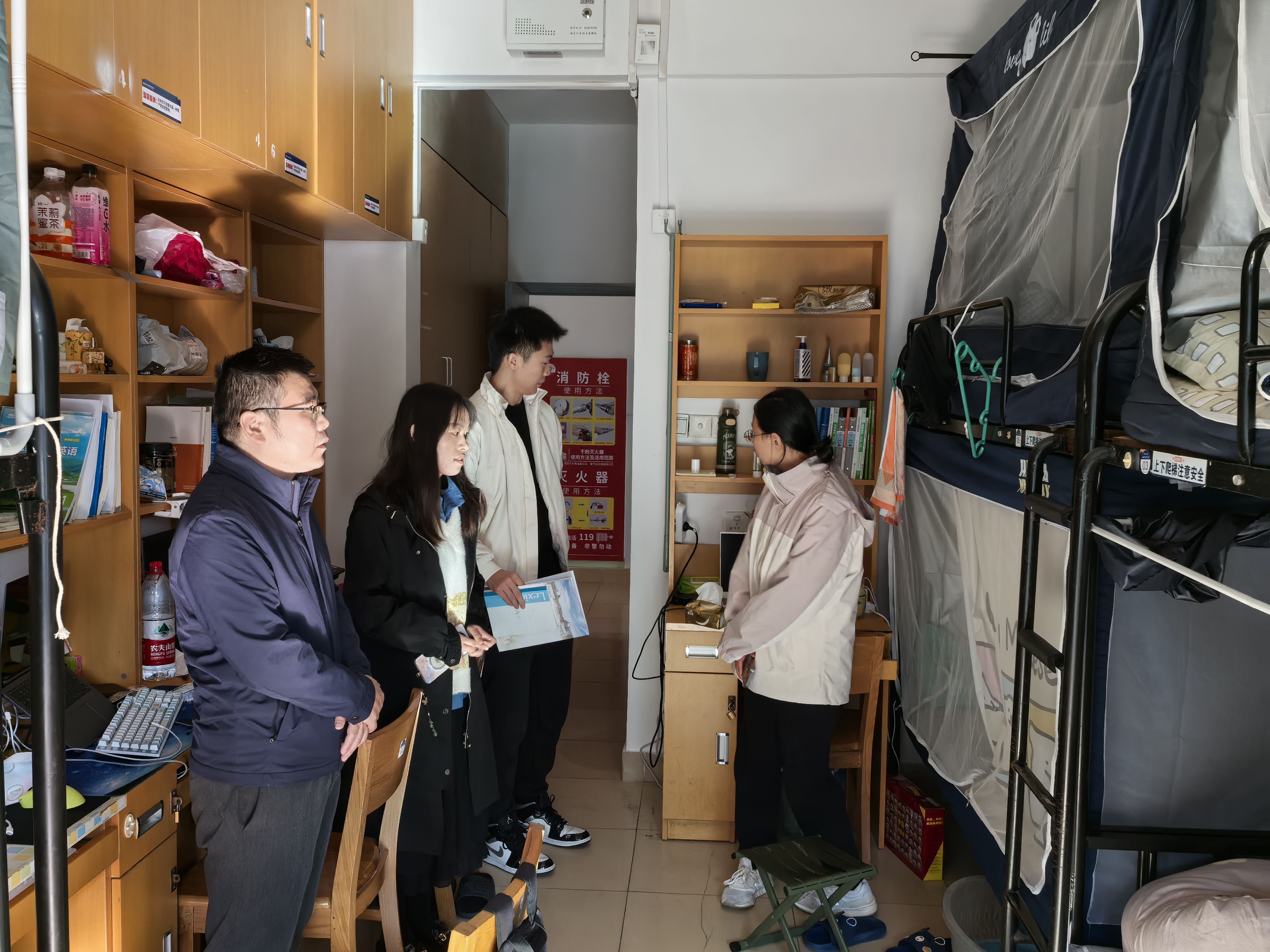 在工作中,检查队伍本着高度认真负责的态度,深入每一间学生宿舍,通过与宿管阿姨细致交流,了解学生平时生活状况,围绕学风引导、安全防范与内务卫生等方面进行重点排查。