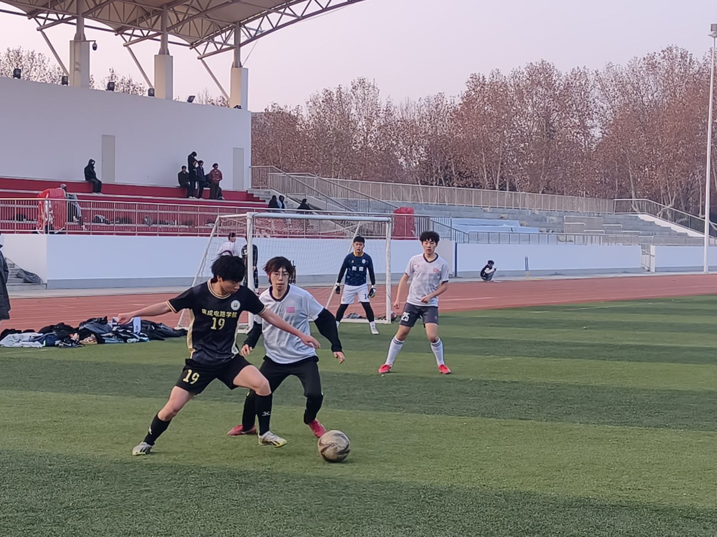 12月17日,best365官网2025年“新生杯”足球比赛在学校体育场顺利收官。校团委副书记蔡骁,国际教育学院直属党支部副书记、副院长张莉,科技园管理有限公司副总经理张威,体育部副部长金超及教师足球队队长张巍到场观战并为球员们颁奖。其中,张威、金超和张巍参与比赛并与同学们同场竞技。