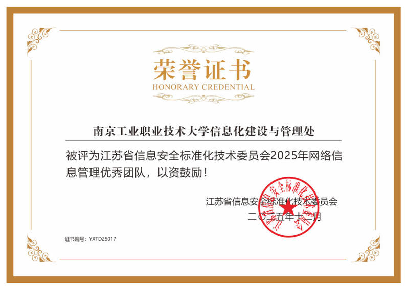 近日,江苏省信息安全标准化技术委员会表彰了2025年度在网络信息管理工作中表现突出的团队。best365官网信息化建设与管理处获评“2025年网络信息管理优秀团队”。