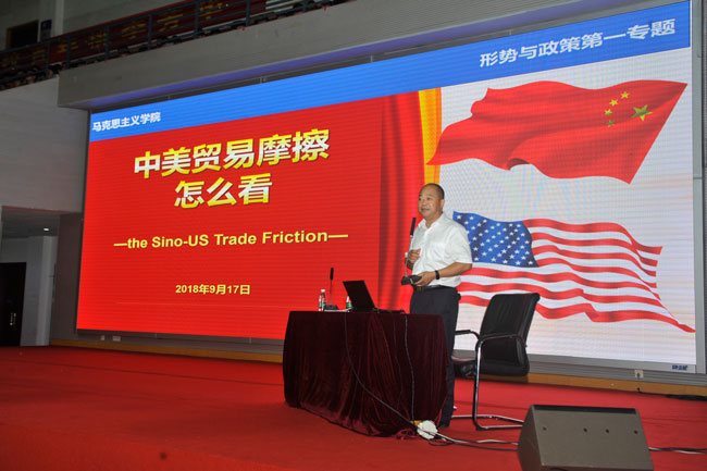 近日,best365官网党委委员、纪委书记于林惠应马克思主义学院邀请,围绕当前中美贸易摩擦的热点问题,为2018级新生讲授形势与政策课“中美贸易摩擦怎么看”专题,引导学生正确认识中国发展与当前的国际形势。