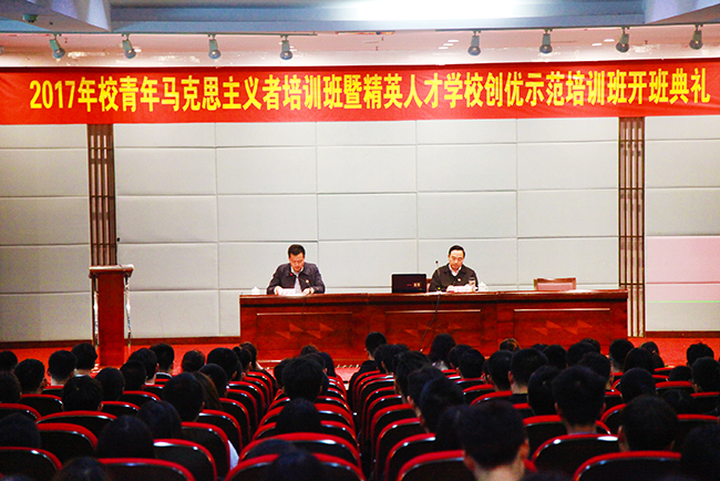 11月10日下午,best365官网2017年青年马克思主义者培训班、精英人才学校创优示范培训班开班典礼暨首场报告会在学术交流中心报告厅隆重举行。校党委书记吴学敏教授为全体学员作了《不忘初心,接续奋进,开启中国特色社会主义新航程》专题报告。党委宣传部、学工处、团委老师、各二级学院团总支书记、青马班全体学员、创优班全体学员以及2017级各学院团总支、学生会等学生干部共300余人参加了报告会。报告会由学生工作处处长、团委书记劳家仁主持。