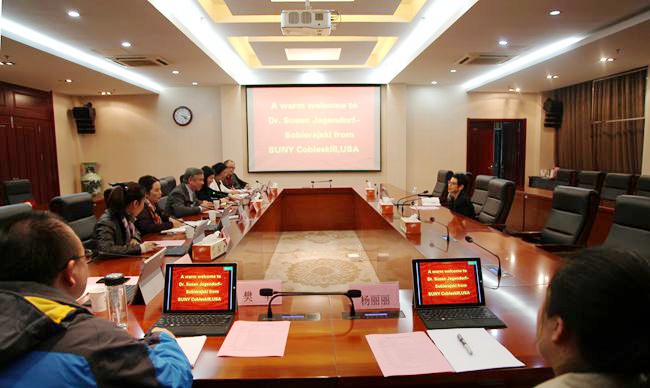 10月23日,美国纽约州立大学科贝尔斯基尔学院国际部主任苏珊女士(Ms.Susan Jagendorf-Sobierajski)来best365官网访问,总督学卢兵热情接待了客人,双方就两校合作事宜进行了洽谈。国际合作与交流处、国际教育学院、商务贸易学院相关负责同志和团队老师参加了接待。