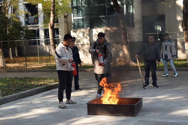 本次活动主要分为消防安全知识讲解、灭火器材使用方法及模拟火场实战演练三个部分。孙军伟首先向同学们强调了提高消防安全意识的重要性以及开展消防演练活动的必要性,希望同学们通过此次演练提高应对突发事件的能力。随后,消防科工作人员向大家详细讲解了手提式干粉灭火器的正确使用方法及注意事项,并进行现场演示。同学们在认真学习观摩后,纷纷动手使用消防器材,体验了灭火过程,进一步提高了消防技能。期间现场进行了消防知识问答,同学们积极回答,现场气氛热烈。