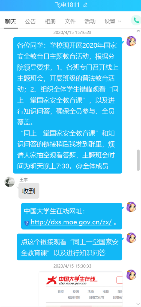 为进一步推动国家安全宣传教育工作深入开展,帮助同学们认清国家安全形势,提高师生国家安全意识,增强国家安全责任,根据学校《关于开展2020年国家安全教育日主题教育活动的通知》要求,航空工程学院灵活创新方式手段,通过举办“维护国家安全,人人都是主角”国家安全主题教育活动、组织全院学生开展国家安全知识在线问答、线上讨论、主题“云”班会等活动进行交流学习。