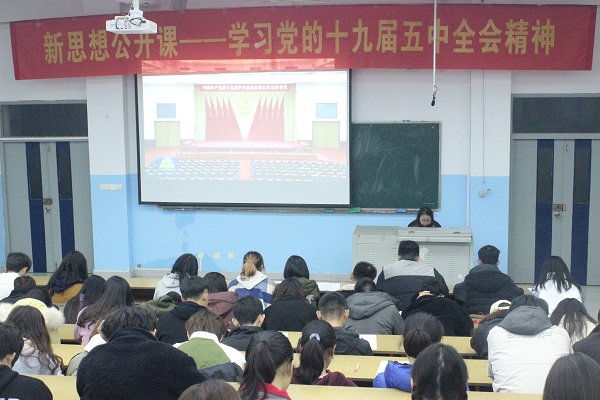 11月25日下午,经济管理学院在乐业楼阶梯教室举办了主题为“学习党的十九届五中全会精神”的新思想公开课,各班级干部和学生会团总支各部门学生干部代表共146名同学参加了此次活动。团总支副书记宋子萱同学组织大家观看了《习近平同志在党的十九届五中全会上的报告和讲话》和《中共中央关于制定国民经济和社会发展第十四个五年规划和二O三五年远景目标的建议》视频。团总支书记许澄澈作了总结,并提出了关于工作和学习方面的希望。有两名同学积极主动与同学们分享了自己对于党的十九届五中全会精神的理解与收获,全场气氛活跃,同学们在交流中碰撞出了思想火花。
