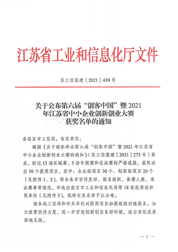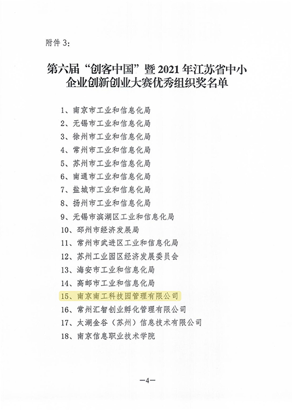 近日,第六届“创客中国”暨2021年江苏省中小企业创新创业大赛顺利落下帷幕,江苏省工业和信息化厅综合各市宣传发动、报名组织、参赛人数、承办赛事等情况,评选了大赛优秀组织奖,best365官网大学科技园运营公司——南京南工科技园管理有限公司名列其中。