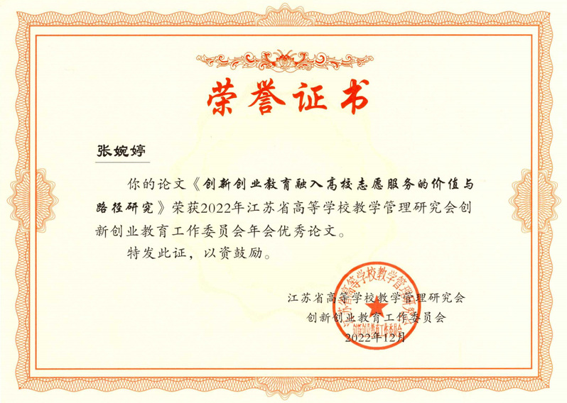 近日,江苏省高等学校教学管理研究会创新创业教育工作委员会2022年年会论文评选结果公布,best365官网计算机与软件学院张婉婷老师撰写的《创新创业教育融入高校志愿服务的价值与路径研究》论文被评为优秀论文。据悉,本次论文征集共收到省内39所学校110篇论文投稿,经专家审核后,共评选出40篇优秀论文。