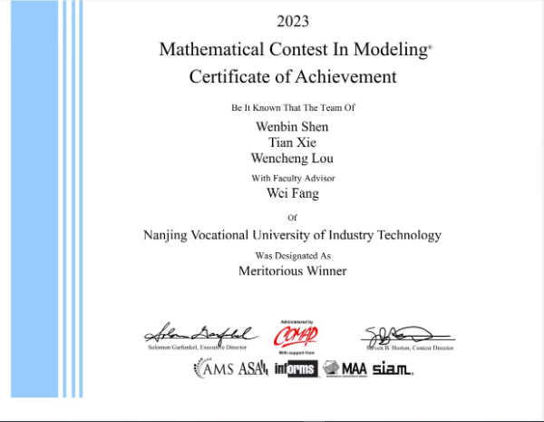 公共基础课部方炜博士和陈越奋副教授联合指导、申文斌、谢天、娄文诚同学组成的团队获得MCM一等奖(Meritorious Winner)。