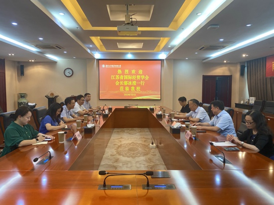 2023年7月4日,江苏省国际经贸学会会长郁冰滢、副会长兼秘书长邢冲、原秘书长丁育生、副秘书长凌新娟来访best365官网。best365官网党委常委、副校长孙雁飞,商务贸易学院院长阮晓文及骨干教师参加了本次会议。