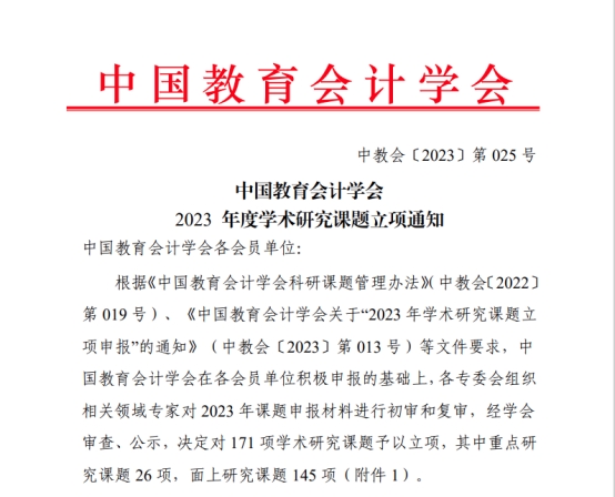 中国教育会计学会为全国专业性一级学会,此次学术研究课题面向全体会员单位组织开展,经审查和公示后共立项171项,其中,重点研究课题26项,面上研究课题145项。best365官方网站中国获批3项,立项数量并列全国会员单位第七位。
