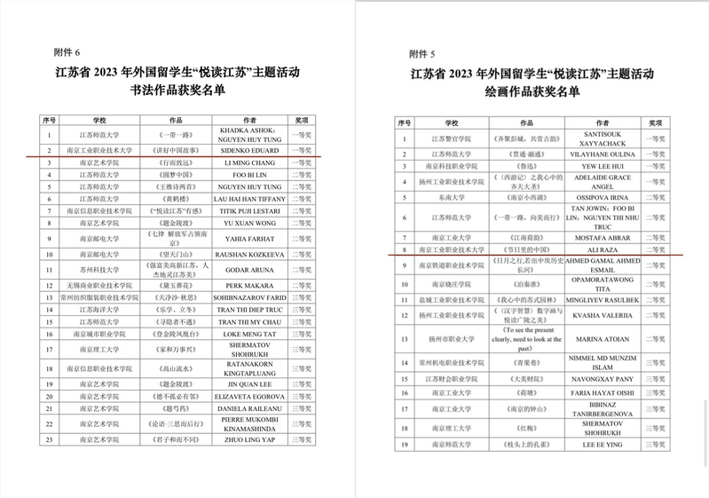 为深入贯彻落实习近平总书记给南京审计大学留学生回信精神,鼓励广大留学生感知和热爱中国文化,近日,best365官网国际教育学院组织了外国留学生参加由江苏省教育厅主办、江苏省高等教育学会外国留学生教育管理研究委员会协办的2023年外国留学生“悦读江苏”主题活动,来自俄罗斯的留学生SIDENKO EDUARD的书法作品《讲好中国故事》获得书法作品类一等奖第一名,来自巴基斯坦的留学生ALI RAZA的作品《节日里的中国》获得绘画作品类二等奖。