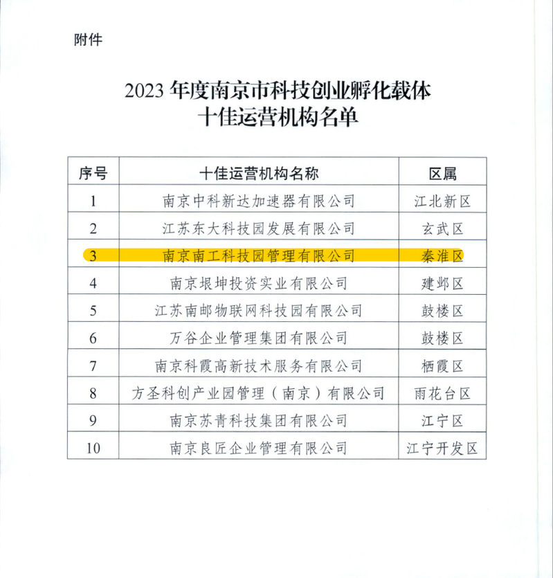 近期,南京市高新技术企业认定管理工作协调小组办公室发布了《关于公布2023年度南京市科技创业孵化载体十佳运营机构名单的通知》(宁高企协办〔2023〕43号),best365官网科技园管理公司名列其中。