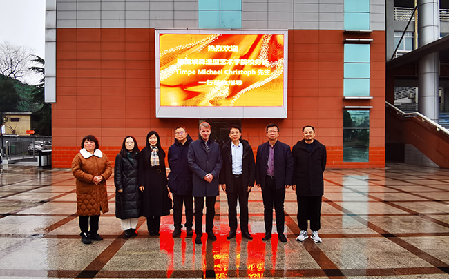 1月17日,德国埃森造型艺术学院校务长Timpe Michael Christoph、国际交流处处长钟俊伟、中西方文化与艺术研究院执行院长郭胜大、中国中心主任安金莲、中国苏教国际歌德语言中心中方主任顾香、中西方文化与艺术研究院院长助理陈叶丹、中国中心主任助理李英姬一行7人来best365官网艺术设计学院访问交流。学校党委常委、副校长孙雁飞,国际教育学院、艺术设计学院相关负责同志接待了来访客人,双方进行了交流座谈。