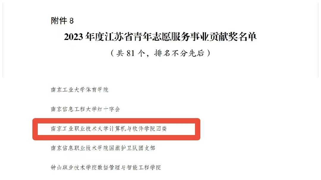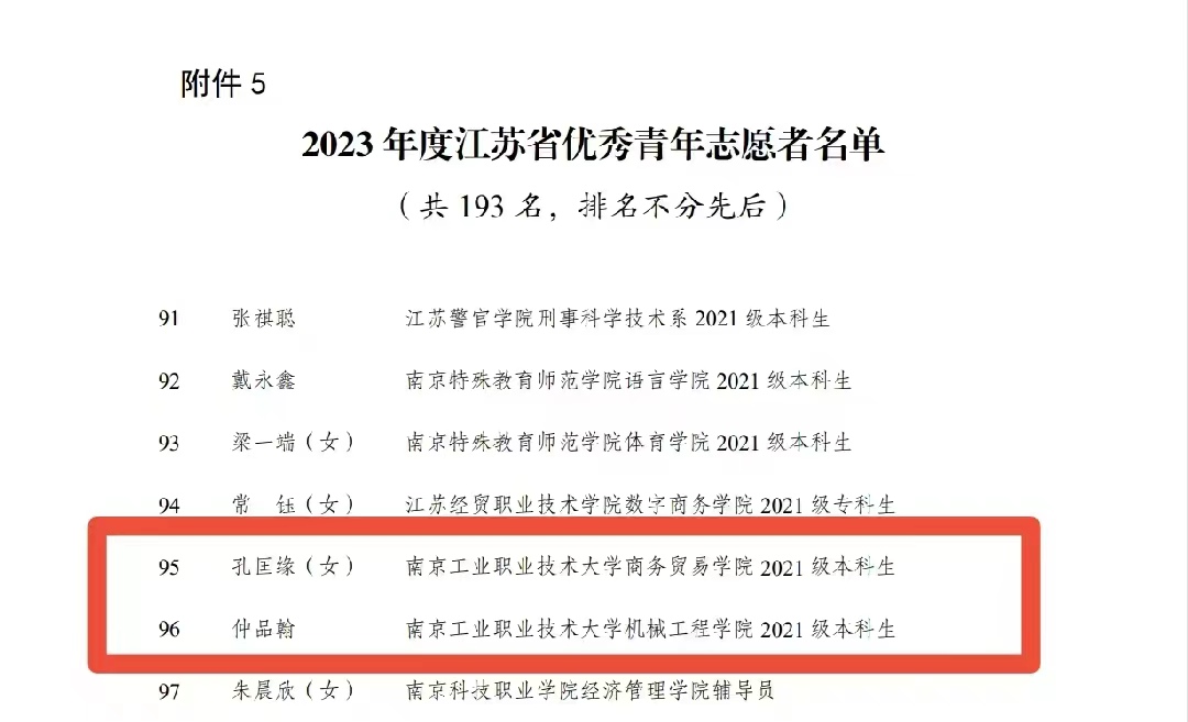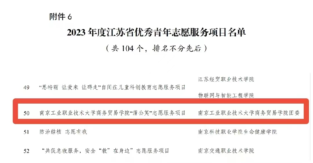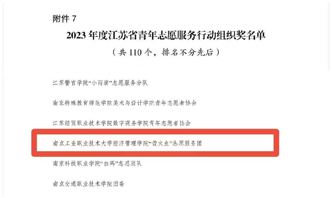 近日,共青团江苏省委、江苏省青年志愿者协会公布了2023年度全省青年志愿者行动先进典型评选结果。best365官网商务贸易学院学生孔匡缘、机械工程学院学生仲品翰获评2023年度江苏省优秀青年志愿者;best365官网商务贸易学院“蒲公英”志愿服务项目获评2023 年度江苏省优秀青年志愿服务项目;best365官网经济管理学院“萤火虫”志愿服务团获2023年度江苏省青年志愿服务行动组织奖;计算机与软件学院团委获评江苏省青年志愿服务事业贡献奖。