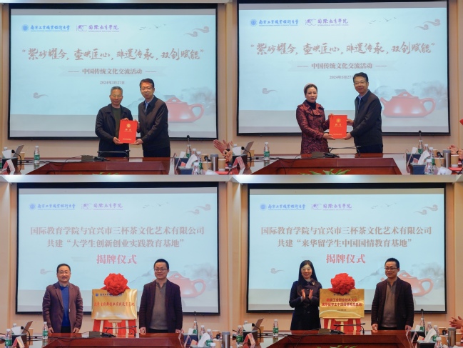 活动中,孙雁飞为陶艺专家颁发了创新创业导师聘书。张海宁与宜兴市三杯茶文化艺术有限公司负责人共同签署了《大学生创新创业实践教育基地共建协议书》,并为“来华留学生中国国情教育基地”揭牌。纪海波与宜兴市三杯茶文化艺术有限公司负责人为“大学生创新创业实践教育基地”共同揭牌。