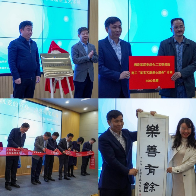 开幕仪式上,冯泉与沈吉鸿共同为“南工星宝艺康爱心服务队”的新实践基地——栖霞区特殊教育学校揭牌。民盟栖霞基层委综合二支部对本次活动给予支持,向爱心服务队捐赠5000元爱心资助金。南京星宝代表们向省民盟、市民盟和南工赠送作品与画册以表达感谢。随后,举行了开幕式剪彩仪式。