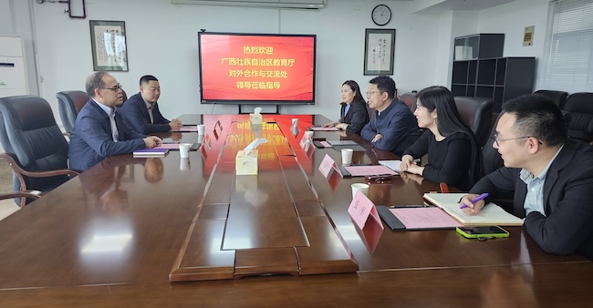 4月17日下午,广西壮族自治区教育厅对外合作与交流处处长罗耀光一行访问best365官网。best365官网党委常委、副校长孙雁飞于行政楼401会议室接待了来宾,国际教育学院相关负责人员参加座谈。