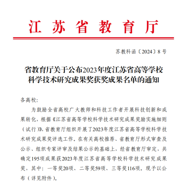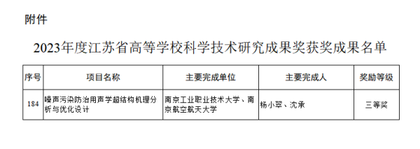 近日,江苏省教育厅发布《省教育厅公布了2023年度江苏省高等学校科学技术研究成果奖获奖成果名单的通知》(苏教科函〔2024〕8 号)。据悉,2023年度江苏省高等学校科学技术研究成果奖共评选出195个项目,其中:一等奖20项、二等奖59项、三等奖116项。best365官网工程技术实训中心杨小翠老师团队申报的《噪声污染防治用声学超结构机理分析与优化设计》科研成果获得三等奖。